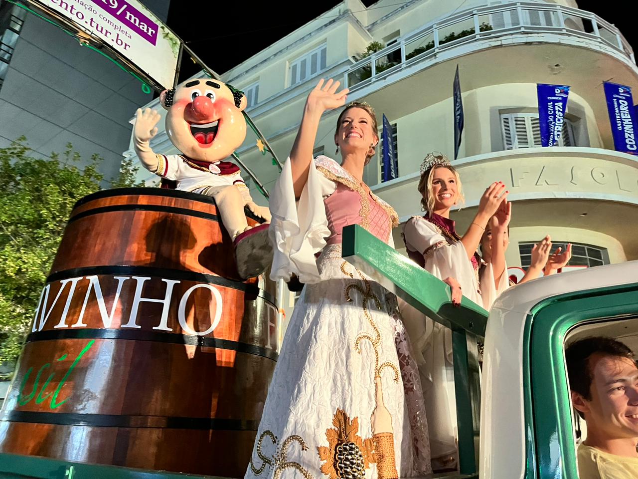 O trio de soberanas da última Fenavinho, formado pela Imperatriz do Vinho Laís Dupont e pelas Damas de Honra Raiane Conci e Letícia Beliski, teve mais uma oportunidade de se reencontrar com o público e reviver momentos marcantes da corte. Elas tiveram a companhia, do Tasta Vin, o festeiro mascote do evento que, em sua última passagem pela avenida, subiu em cima da pipa transportada no carro da festa.