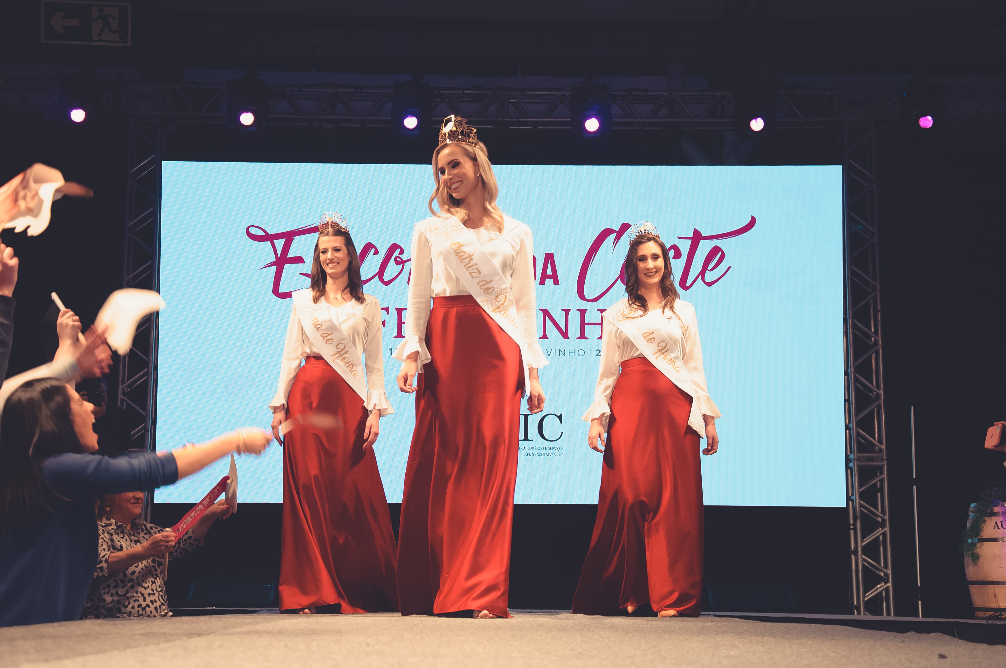 A corte da 17ª Fenavinho está eleita: Laís Dupont, representante do Segh Uva e Vinho, foi coroada Imperatriz do Vinho, e Raiane Conci (representante do Vale do Burati) e Letícia Beliski (representante da a ONG Patas e Focinhos) as Damas de Honra. Caberá a elas a importante missão de representar a Festa Nacional do Vinho – e todo o simbolismo histórico e cultural que ela carrega. A escolha ocorreu na noite de hoje (23), no Parque de Eventos de Bento Gonçalves, perante um público de mais de 700 pessoas, no hall do Pavilhão A.
