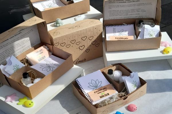 Comercializa kit relaxante, com escalda pés, vela aromática, essência, chá, agenda, squishy (brinquedo macio) e uma play list de músicas para relaxar.