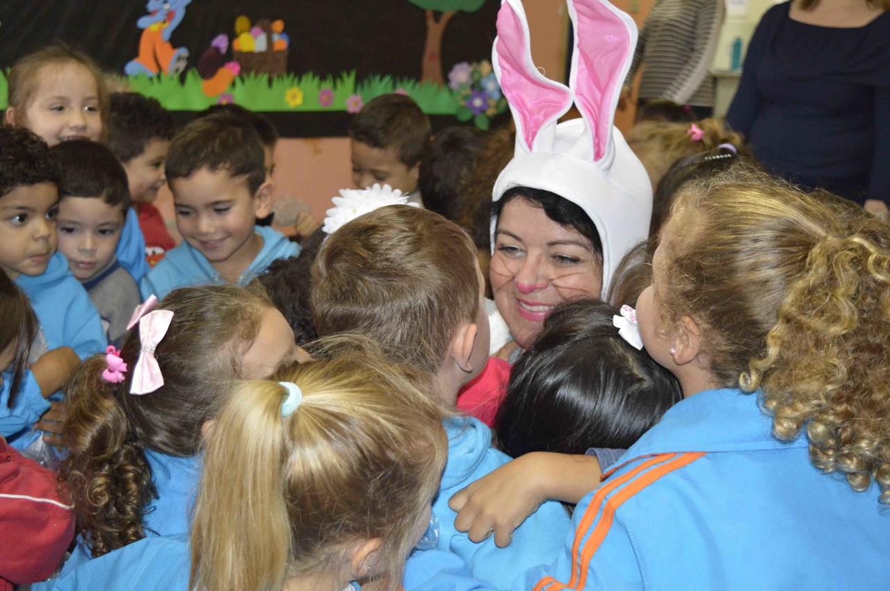 Para explorar a ludicidade da Páscoa, a voluntária Kely Ginar Viana estreou no papel de senhora coelha, atendendo a um chamado da escola. Como atividade de produção textual, os alunos convidaram a coelhinha para o colégio, aprendendo, dessa forma, a como escrever uma cartinha. Pela primeira vez, Kely vestiu uma fantasia e, além de distribuir doces, contou a história da data. “Estava nervosa, mas abracei a causa da escola, porque a gente recebe muito mais do que dá nessas ações, ainda mais com crianças que têm um coração muito puro”, diz a voluntária. Numa outra atividade, os alunos precisaram pesquisar uma receita de Páscoa e levar para a escola. Após, escolheram uma para preparar no refeitório e se deliciar com o quitute.