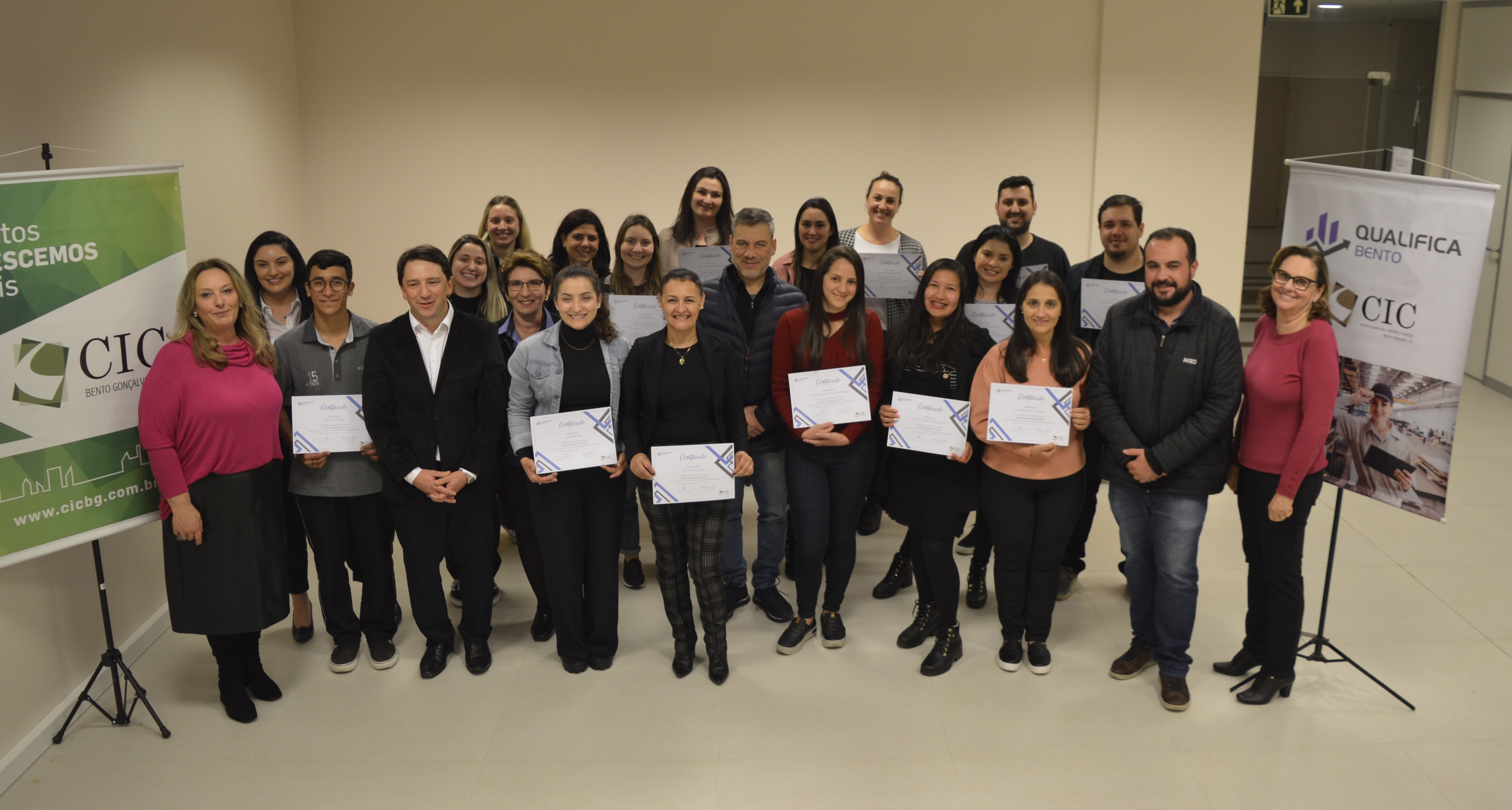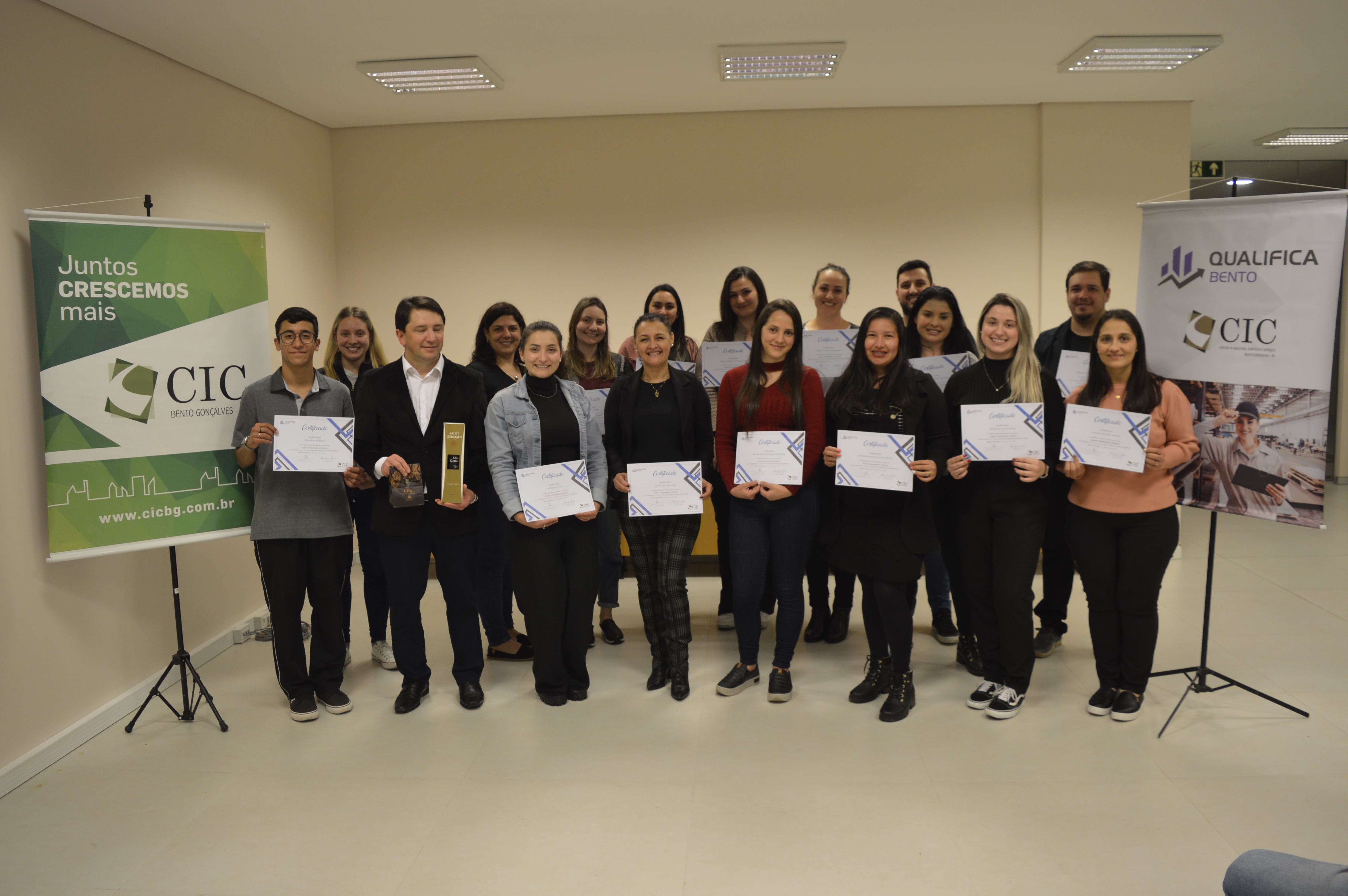 Mais uma importante etapa de formação promovida pelo Qualifica Bento foi concluída na noite de segunda-feira (25). A turma do curso "Dicção, Desinibição e Oratória" recebeu os certificados de conclusão durante cerimônia realizada no prédio do Centro da Indústria, Comércio e Serviços de Bento Gonçalves (CIC-BG), mantenedor do projeto. No total, foram 17 alunos diplomados.