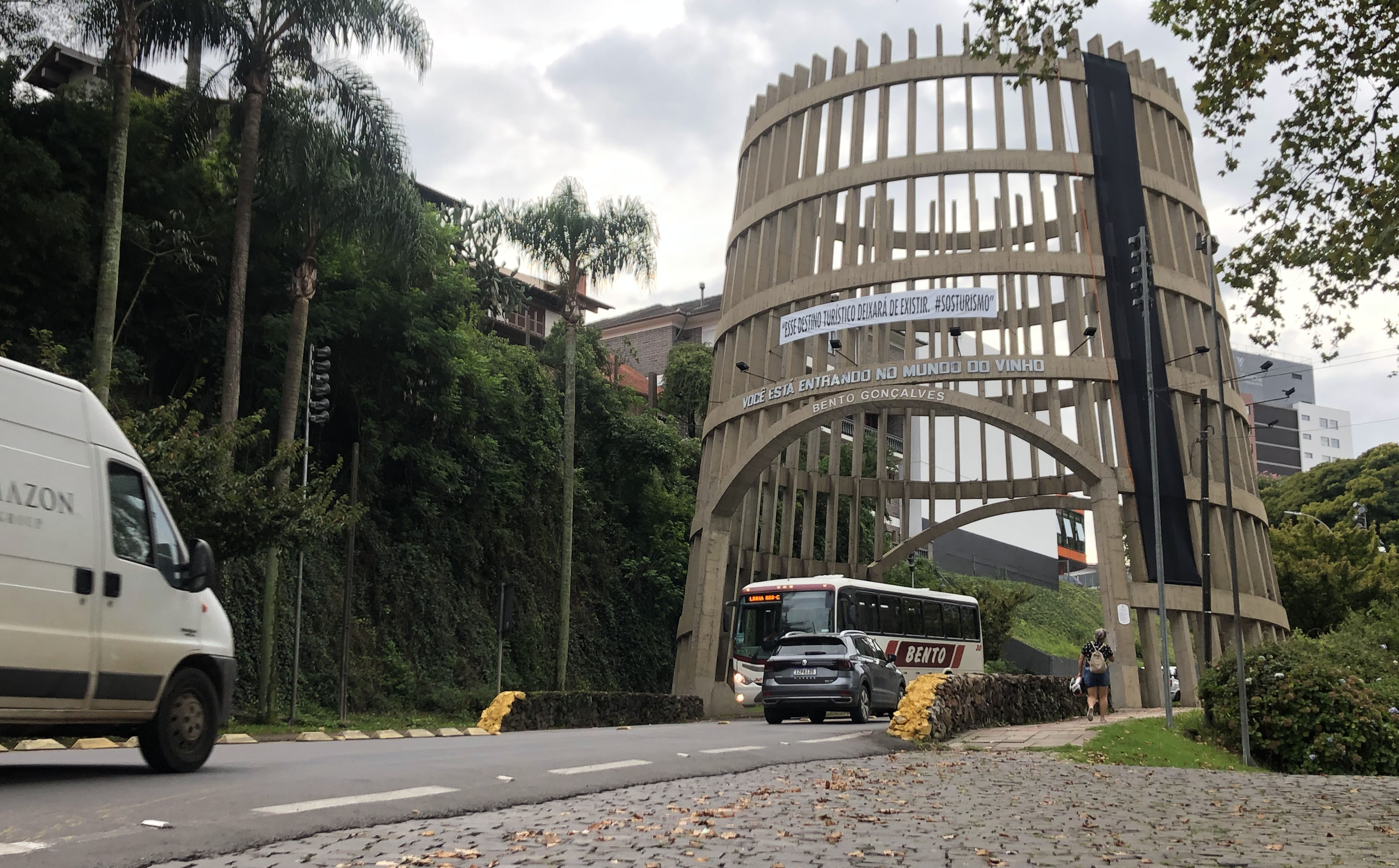 Cartão postal de Bento Gonçalves, a Pipa Pórtico, localizada no acesso principal à cidade, amanheceu enlutada nesta terça-feira. O motivo foi uma ação de sensibilização assinada pelos profissionais ligados ao segmento do turismo – impedidos de trabalhar por quatro semanas, em função das restrições impostas pelo modelo de Distanciamento Controlado do Governo do Estado do Rio Grande do Sul. Sobre o monumento de mais de 15 metros de altura, eles estenderam uma faixa com os impactantes dizeres "Esse destino turístico deixará de existir. #SOSTURISMO".