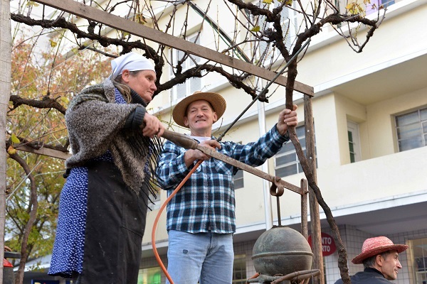 No carro seguinte, o distrito mostrou a evolução dos equipamentos utilizados no tratamento das videiras – da máquina costal manual, feita em madeira, passando pela produzida em cobre e pela bomba fixa manual, até chegar ao atomizador costal motorizado e o pulverizador acoplado no trator. No último carro, o resultado disso tudo: o vinho, sustento das famílias e símbolo do município.